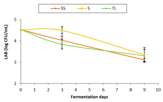 LAB population (log CFU/mL) throughout AF in the different inoculation strategies (SS: spontaneous sulfite, S: spontaneous without SO2, TL: inoculation with T. delbrueckii/L. thermotolerans at vatting without SO2).