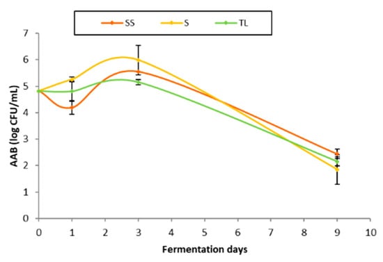AAB population (log CFU/mL) throughout AF in the different inoculation strategies (SS: spontaneous sulfite, S: spontaneous without SO2, TL: inoculation with T. delbrueckii/L. thermotolerans at vatting without SO2).