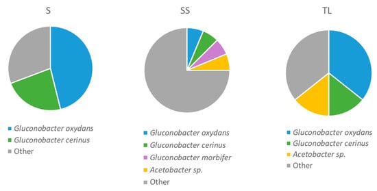 Proportion of AAB species at 24 h after vatting in the different inoculation strategies (SS: spontaneous sulfite, S: spontaneous without SO2, TL: inoculation with T. delbrueckii/L. thermotolerans at vatting without SO2).