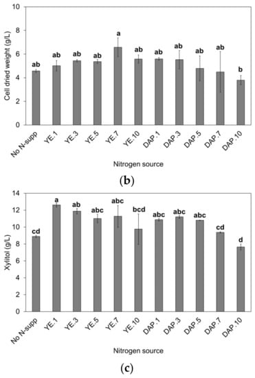 | N Source | Xylitol Yield (g/g) | Cell Yield (g/g) | ||