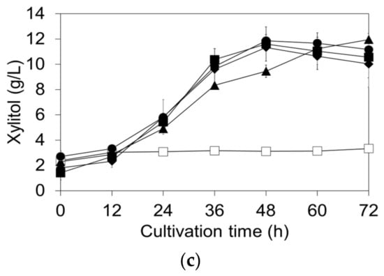 - Tamburini, E.; Bianchini, E.; Bruni, A.; Forlani, G. Cosubstrate Effect on Xylose Reductase and Xylitol Dehydrogenase Activity Levels, and Its Consequence on Xylitol Production by Candida tropicalis. Enzyme Microb. Technol. 2010, 46, 352–359. [Google Scholar] [CrossRef]