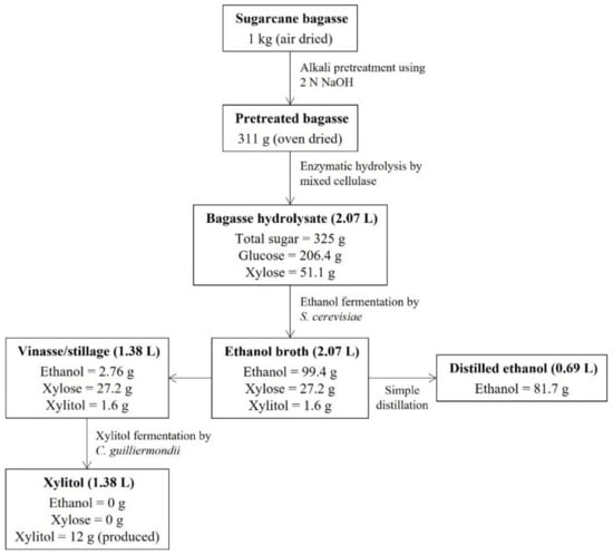 - Unrean, P.; Ketsub, N. Integrated Lignocellulosic Bioprocess for Co-Production of Ethanol and Xylitol from Sugarcane Bagasse. Ind. Crops Prod. 2018, 123, 238–246. [Google Scholar] [CrossRef]