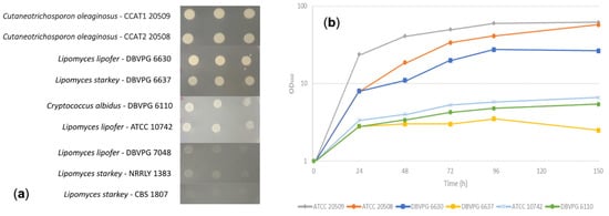 Some species of oleaginous yeasts possess β-galactosidase activity and can use lactose, but this ability can be strain-specific. In order to verify the presence of this trait, 16 strains were cultivated on YNB-lactose plates. All the “red” strains (Rhodotorula/Rhodosporidium) were unable to grow, as well as Lipomyeces lipofer DBVPG 7048, and Lipomyces starkeyi NRRLY 1383 and CBS 1807. The strains able to grow were Cutaneotrichosporon oleaginosus ATCC 20509 and ATCC 20508, Lipomyces lipofer DBVPG 6630, Lipomyces starkey DBVPG 6637, and Lipomyces lipofer ATCC 10742 and Cryptococcus albidus DBVPG 6110 (Figure 1a).
