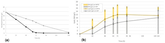 Based on the consideration that WP contains low amounts of nitrogen and other essential nutrients, such as vitamins and trace elements, another set of flask cultivations was performed on WP supplemented with YE (WPYE) to supply these nutrients. For these experiments, the ATCC 20508 strain was not included due to its high similarity in terms of biomass and lipid production with ATCC 20509 and due to better knowledge of the latter strain arising from previous studies performed at our laboratory [23]. Under these conditions, the main positive effect caused by the presence of YE was in terms of the sugar consumption rate (Figure 2a). The cells consumed lactose faster, being almost exhausted after 72 h, in comparison to the sole WP, in which 25 g/L of disaccharide was still present at this time (Figure 2a). This resulted in faster biomass and lipid production, which reached the highest concentrations after 72 h (Figure 2b). The final biomass and lipid concentrations increased in the presence of YE, leaving the cellular lipid content substantially unaltered (Figure 2b).