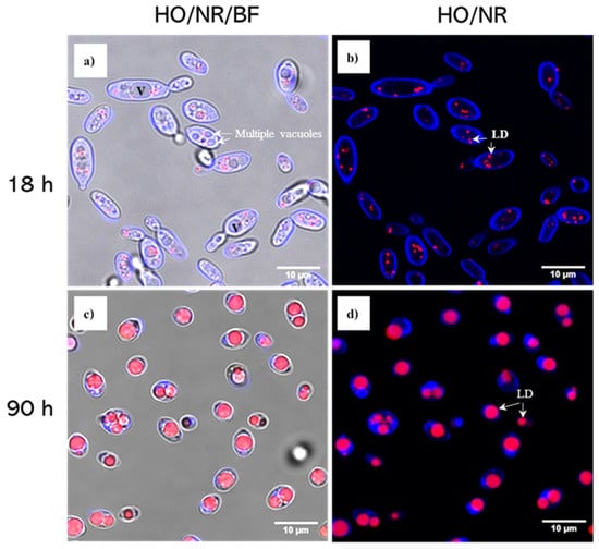 Confocal laser scanning microscopy of C. oleaginosus ATCC 20509 observed after 18 h (a,b) and 90 h (c,d) of cultivation in WPYEU. Cells (in blue) are stained with Hoechst 34580 (HO), while lipid droplets (LDs) (in red) are stained with Nile red (NR). Vacuoles (V) were observed in bright field (BF).