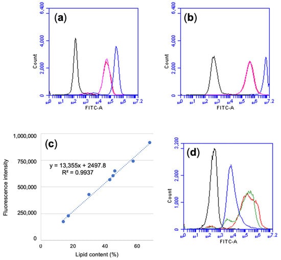 (a,b) FACS histograms showing different BODIPY 493/503 concentrations on ATCC 20509 samples collected at 24 h (a) and at 90 h (b) of the production process. Black line = unstained sample; pink line = 0.75 µM BODIPY 493/503; red line = 1.5 µM BODIPY 493/503; blue line = 7.5 µM BODIPY 493/503. (c) Calibration curve correlating the BODIPY 493/503 fluorescence intensity with lipid content (expressed in % on dry weight) detected by colorimetric method. (d) FACS histogram showing BODIPY 493/503 fluorescence in different strains. Black line = unstained sample; blue line = DBVPG 6630; green line = ATCC 20508; red line = ATCC 20509.