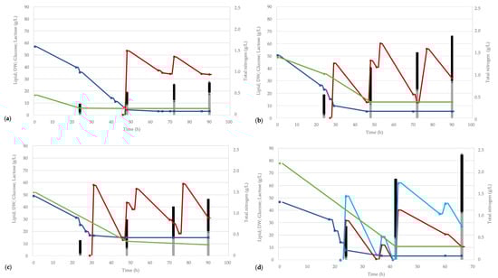 The first process (Figure 5a) was run on WP supplemented with YE (WPYE) and likewise cultivation in flask at a C/N ratio of 60.50 (Table 2). Under these conditions, C. oleaginosus grew at a rate of 0.26 h−1 (Table 2). Due to the higher amount of YE and dissolved oxygen, and under controlled pH conditions, C. oleaginosus developed a higher biomass concentration of 26.5 ± 0.27 g/L in comparison with the flask cultivations. The high C/N ratio of this medium allowed the cells to rapidly reach the metabolic phase of lipid accumulation. After 48 h of the process, the lipid content in fact represented 46% of the DW (Figure 5a). At this point, with the lactose almost totally consumed, glucose feeding was started. This restored a high C/N ratio which boosted lipid accumulation, resulting in a final lipid content of 68%, being among the highest ever registered for this strain [25,26,27]. This corresponded to a final lipid production of 18.0 ± 1.3 g/L (Table 2). In conclusion, under these conditions, lipids were produced with a yield of 0.21 (calculated on the total sugar utilized) and a productivity of 0.2 g/L/h.