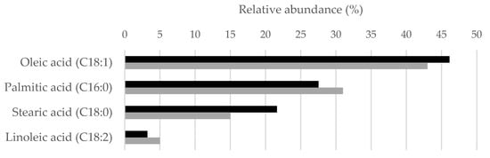 Lipids synthesized by the C. oleaginosus ATCC 20509 strain are known to be mainly composed of long-chain fatty acids with 16 and 18 carbon atoms, with a profile similar to vegetable fats [12,34]. At the end of the process carried out on the medium WPYEU, the lipid extract was found to contain 77.3% of TAGs, 16.4% of DAGs, and 6.3% of MAGs (Figure S3). The main fatty acids produced were 46.14 ± 0.65% oleic acid (C18:1), 27.53 ± 0.29% palmitic acid (C16:0), 21.63 ± 0.21% stearic acid (C18:0), and 3.22 ± 0.31% linoleic acid (C18:2) (Figure 7, Figure S4). On the whole, the lipid profile obtained by cultivation on a permeate-based medium containing urea as a nitrogen source appeared to be quite similar to those obtained on a glucose-based medium containing ammonium sulfate [23]. These results indicate that the composition of the permeate-based medium, and the presence of urea as a nitrogen source did not significantly affect the fatty acid profile of lipids produced by C. oleaginosus ATCC 20509.