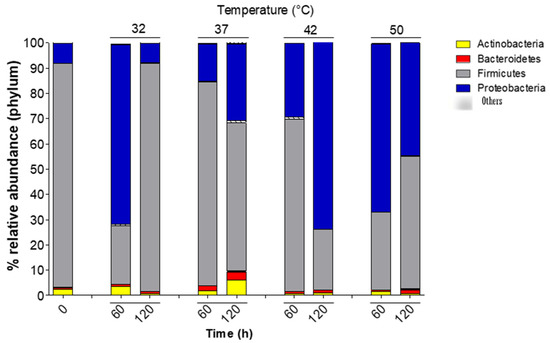Thirty phyla were identified, but only Firmicutes, Proteobacteria, Actinobacteria, and Bacteroidetes were predominant in all samples (Figure 1), which could be considered the “core microbiota of whey”. The microbiota in fresh whey is expected to be like the milk used and environmental conditions in cheese-making [12,13]. Firmicutes was the predominant phylum in fresh whey (89.47%), as well as in most samples of fermented whey. This bacterial diversity could be related to the optimum growth temperature for most bacteria (30–40 °C) [14]. However, this bacterial distribution was modified during SWF at different temperatures and times (Figure 1). Firmicutes predominance decreased, and Proteobacteria increased during fermentation at 37 and 42 °C.