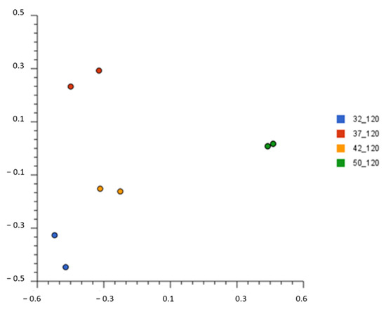 Principal component analysis of whey microbiota (at specie level) after 120 h of fermentation at 32, 37, 42, and 50 °C. The distance among points is inversely proportional to microbiome similarity.