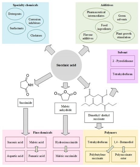 Succinic acid (SA) is a key platform chemical for the bioeconomy due to the reactivity of its two functional carboxylic groups, which allows for obtaining a wide range of end-products [,]. In fact, according to the United States Department of Energy (US DOE), this compound is one of the target molecules that could be produced from biorefinery carbohydrates and from which many other products of interest may arise [,]. In fact, SA is considered the most important C4 building block and is widely used in several industries [,,]