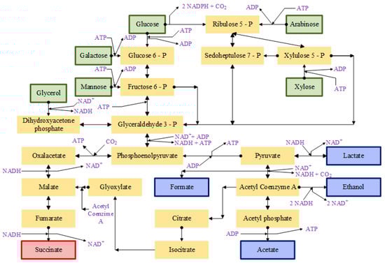 Metabolic pathways in succinic acid-producing microorganisms such as A. succinogenes, A. succinoproducens, M. succiniproducens and anaerobic succinate engineered E. coli. [,,], Adenosine triphosphate (ATP), flavin adenine dinucleotide (FAD+), nicotinamide adenine dinucleotide (NAD+), reduced nicotinamide adenine dinucleotide (NADH), and reduced nicotinamide adenine dinucleotide phosphate (NADPH).