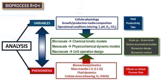 Therefore, to conduct fermentation processes at an industrial level implies the consideration of different amounts of materials and energy inputs at each production level, which can affect the behavior of the microorganism; therefore, it is necessary to approach an isolated study of different individual phenomena and variables on a laboratory scale prior to their simultaneous consideration. In this way, proper coupling of the phenomena can then accurately describe the overall process [,], as shown in Figure 3, from the point of view and language of chemical reaction engineering.