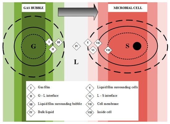 Until now, the studies carried out on the mass transfer of CO2 are scarce and limited to very specific systems, and without application to cellular systems; therefore, it is important to highlight the importance of increasing knowledge in this area. Due to the multiple phenomena that take place at the same time, the mass transfer of CO2 is difficult to estimate, being influenced by a large number of parameters, such as the physical properties of the gaseous and liquid phase, the operating conditions, the geometric parameters and the state of the biomass. In fermentations, biochemical processes and transport take place at the same time; therefore, it is essential to know the speed at which each one of them takes place and to know the limiting stages. For example, in the event that the rate of transport of the substrates to the cells is higher than the rate of metabolic reactions, the overall rate of conversion would depend on the kinetics of the biochemical reactions. In the opposite case, in which the transfer rate was lower than that of the reaction, it would be essential to make efforts to reduce the average time needed for mass transfer to prevent it from continuing to be the limiting stage. Thus, the study of the overall mechanism of their transfer can be outlined in several stages depending on the location, as shown in Figure 4 [,,,].