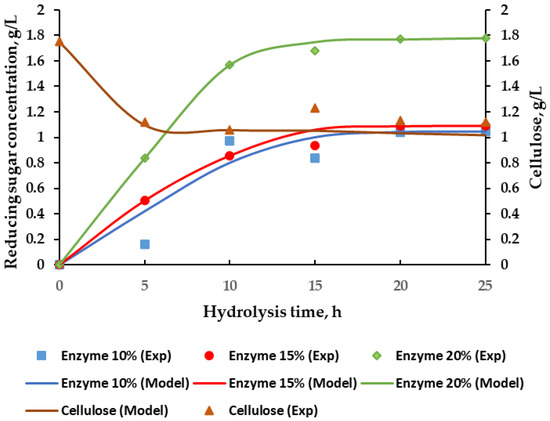 Several researchers have studied the enzymatic hydrolysis kinetics of biomass, in particular with coffee silver [27], bagasse [28,29], sugarcane straw [30], shredded seed shells of Colocynthis Vulgaris [31], mixed shells [32], wheat straw [33], wild ryegrass creeping [34], Miscanthus and wheat clots [35], and corn stover [36]. Another study investigated the enzymatic hydrolysis kinetics of NaOH pre-treated rice [37]. However, there are no documented studies on the Michaelis–Menten model to investigate the enzymatic hydrolysis of pre-treated rice husks with H2O2-NH4OH. Therefore, this study aims to determine the enzymatic hydrolysis kinetics of cellulose from rice husks using a semi-mechanistic model. We used the integrated Michaelis–Menten equation to examine the kinetics of the enzymatic hydrolysis of cellulose from rice husks. The statistical, theoretical, and experimental data manipulation confirmed the mathematical model’s adequacy.