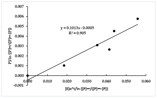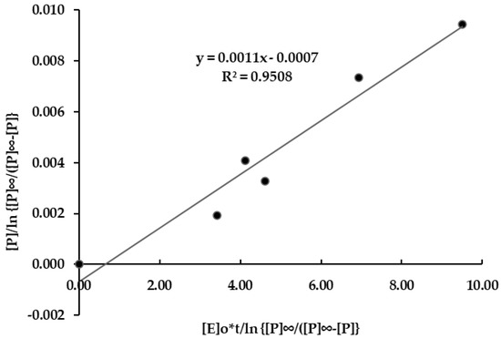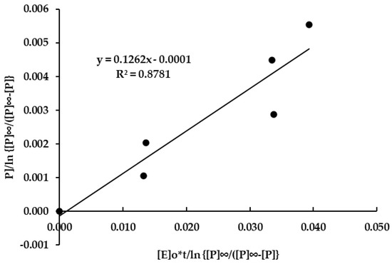 According to [24], the enzymatic hydrolysis substrates’ kinetics were determined by a modified version of the Michaelis–Menten equation, and then the results were validated with experimental data. The enzymatic hydrolysis reaction was carried under transient conditions because the excess substrate inhibited hydrolysis. Under such conditions, it is unacceptable to neglect the change in the concentration of the enzyme–substrate complex. Several factors, including the chemical components of the reactant molecule, the product, the concentration of the reacting substance or substrate, the temperature, and the catalyst, influence the kinetics of the reaction. The kinetics of the reaction was determined based on Equation (14). Figure 2, Figure 3 and Figure 4 show the relationship between [P]/ln{[P]∞/([P]∞ − [P]} and [E]0.t/[P]/In{[P]∞/[P]∞ − [P]} at various enzyme concentrations.