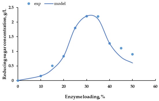 Figure 5 presents the effect of enzyme concentration on the reducing sugar levels for 5 h of hydrolysis time. According to Figure 5, during the 5 h enzymatic hydrolysis reaction, the optimal reducing sugar concentration was about 2.21 g/L, obtained at enzyme concentrations of 30%. For enzyme concentrations of less than 30% (v/w), the enzyme concentration was directly proportional to the resulting reducing sugar. The optimal enzyme loading for the cellulase-mediated enzymatic hydrolysis of pre-treated rice husk was 30% (v/w), which enhances the sugar concentration. As the enzyme loading was increased to between 35 and 50% (v/w), the reducing sugar concentration decreased dramatically. This two-phase response of sugar concentration to different enzyme loading is observed because hydrolysis is an enzyme-limited activity at low enzyme to substrate loading (i.e., 25% (v/w) enzyme loading). In comparison, excess enzymes at enzyme loading > 30% (v/w) sped up the hydrolysis rate and made products (glucose and other reducing sugars) that inhibited the free enzymes in the liquid phase by binding to them. The substrate–enzyme complexes hindered the cellulase’s catalytic activity and reduced the concentration of reducing sugars [56]. For enzyme concentrations of more than 30% (v/w), the lowest reducing sugar concentration (0.89 g L−1) was obtained.