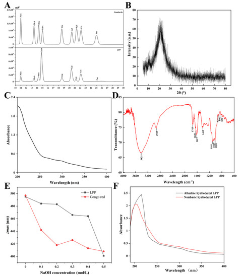 The crystalline structure of LPP was examined using XRD, with patterns recorded from 5° to 80° (Figure 1B). A broad peak spanning the 2θ values from 10° to 30° and distinctive diffraction peaks at 20.42° indicated that the LPP formed an amorphous body, which was consistent with the result of the Congo red experiment. Moreover, Jeddou et al. [27], Ma et al. [35], Zhao et al. [24], and Abuduwaili et al. [11] also obtained similar results.