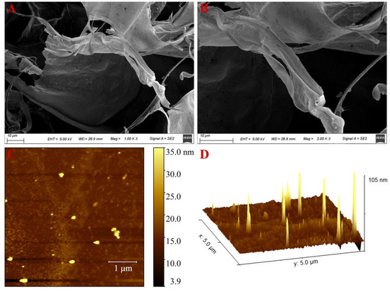 (A) 1000 × SEM images of LPP, (B) 2000 × SEM images of LPP, (C) planar AFM images of LPP, and (D) three-dimensional AFM images of LPP.
