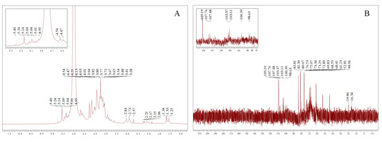 NMR spectroscopy is widely used to analyze the structures of complex polysaccharides, such as α- or β-configurations, glycosidic linkages, and the linkage sequence of sugar residues [8,15,16,26,29,34,38]. The 1H and 13C NMR spectra of LPP are presented in Figure 3. The anomeric hydrogen at 4.4–5.5 ppm and the anomeric carbon at 95–110 represented both α-glycosidical and β-glycosidical configurations in LPP [10]. In the 1H spectra (Figure 3A), there were nine major anomeric proton signals in the anomeric region from 4.4 to 5.5 ppm, meaning that LPP contains heteropolysaccharides with nine residues, which is consistent with the monosaccharide composition results [36]. The signals at 4.95 ppm, 5.14 ppm, and 5.09 ppm were assigned to the H-1 of α-1,4-linked GalAp, α-Araf, and α-1,5-linked Araf, respectively [10]. Meanwhile, methyl proton signals of the Rha and acetyl groups were observed around 1.25 and 2.17 ppm, respectively [38].