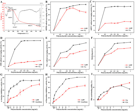 The properties of LPP. (A) Thermal properties, (B) DPPH radical scavenging activity in vitro, (C) ABTS+ radical scavenging activity in vitro, (D) •OH radical scavenging activity in vitro, (E) NO2− radical scavenging activity in vitro, (F) reducing power in vitro, (G) α-amylase inhibitory activity, (H) α-glucosidase inhibitory activity, and (I) bile-acid-binding ability.