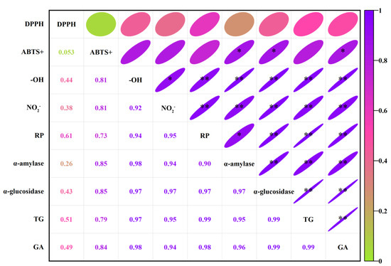 Correlation analysis of bio-activities based on the Pearson correlation (* p < 0.05, ** p < 0.01).