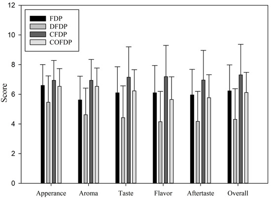 Sensory evaluation results of fermented Taiwan djulis and other similar fermented dairy products. FDP: Fermented dairy products; DFDP: Taiwan djulis fermented dairy products; CFDP: Cereal fermented dairy products; COFDF: Commercial original fermented dairy products. The number of evaluations was 52, and the results were expressed as mean ± SD. Different letters indicate significant differences from each other.