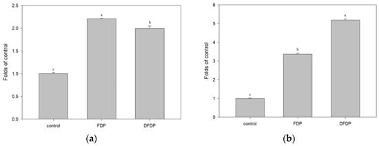 The seeds of djulis are rich in phenolic compounds, especially flavonoids, which promote health benefits and prevent diseases. The content of total flavonoids increased to five times that of the untreated group, and the results were in line with expectations (FDP: 0.636 ± 0.094 mg QE g−1; DFDP: 3.050 ± 0.026 mg QE g−1).