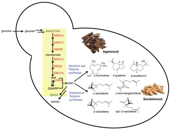 Metabolic engineering of S. cerevisiae for production of fragrant terpenoids from agarwood and sandalwood. Mevalonate pathway enzymes (yellow box, highlighted in red) were overexpressed to increase the pool of the key intermediate farnesyl pyrophosphate (FPP). Terpene synthase enzymes (highlighted in blue) were heterologously expressed in the engineered yeast to produce the fragrant terpenoids. Expression of the squalene synthase enzyme ERG9 was repressed to minimize the diversion of FPP towards sterol biosynthesis. ERG10, Acetyl-CoA C-acetyltransferase (acetoacetyl-CoA thiolase); ERG13, 3-hydroxy-3-methylglutaryl-CoA (HMG-CoA) synthase; HMGR, HMG-CoA reductase; ERG12, Mevalonate kinase; ERG8, Phosphomevalonate kinase; ERG19, Mevalonate pyrophosphate decarboxylase; FPPS, farnesyl pyrophosphate synthetase (synthase); ERG9, squalene synthase.