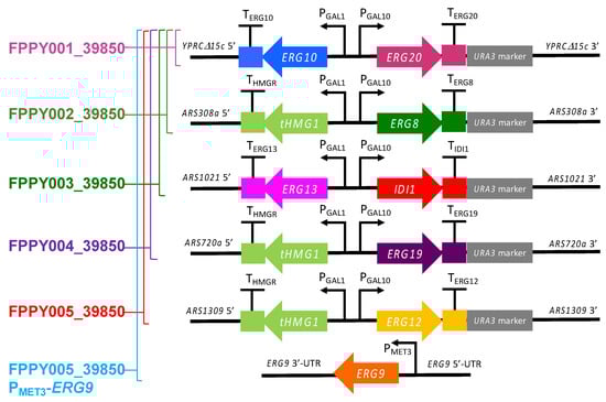 The gene expression cassettes for the upregulation of the mevalonate pathway were sequentially integrated into the genome of BCC39850hlu (S. cerevisiae BCC39850 with triple deletions) at designated sites, as shown in Figure 2 (YPRCΔ15c, ARS308a, ARS1021, etc.). Integration of gene expression cassettes at these sites has previously been shown to lead to high gene expression levels [23].