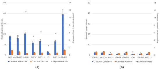 Engineered strains were pre-cultured in 5 mL aliquots in an SC yeast minimal medium (1X yeast nitrogen base, 2% glucose, complete supplement mixture (CSM)) overnight and used to inoculate 5 mL fresh SC-mixed carbon source medium (1× yeast nitrogen base, 1.8% galactose, 0.2% glucose, complete supplement mixture (CSM)) in 50 mL Falcon tubes to achieve an initial OD600 of 0.05. The cultures were grown at 30 °C and 250 rpm in an orbital shaking incubator. After 24 h, a 1.2–1.5 mL aliquot of each culture was collected and centrifuged for 5 min at 3000× g. The pellets were washed with 5 mL of distilled water. Total RNA was extracted using the QIAgen RNeasy Kit under the manufacturer’s protocol. Contaminating genomic DNA was removed from the RNA samples by DNaseI (Thermo Fisher Scientific, Waltham, MA, USA) digestion using the manufacturer’s protocol. The RNA quantity was analyzed using a NanoDrop ND-1000 spectrophotometer (NanoDrop Technologies, Wilmington, NC, USA), and samples were stored at −80 °C until RT-PCR analysis. cDNA was obtained using RevertAid Reverse Transcriptase (Thermo Fisher Scientific, Waltham, MA, USA) using the manufacturer′s protocol. Relative expression levels of ERG10, ERG20, tHMG1, ERG8, ERG13, IDI1, ERG19, and ERG12 were quantified using iQ SYBR Green Kit (Bio-Rad, Hercules, CA, USA) on CFX96 Touch Real-time PCR Detection System (Bio-Rad, Hercules, CA, USA). Real-time PCR was performed in triplicate, and TAF10, a gene that encodes a subunit of transcription factor IID (TFIID), was used to normalize the amount of the total mRNA in all samples. Primers for real-time PCR are listed in Table S1.