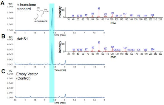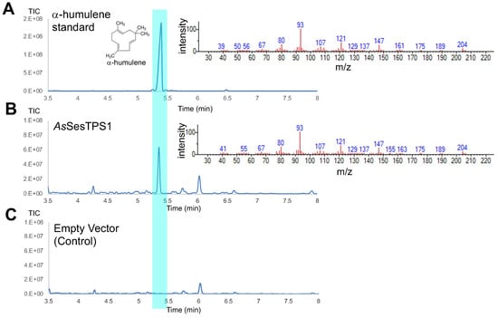 Total ion chromatograms (left panel) and mass spectra (right panel) obtained from GC-MS analysis of an authentic standard for α-humulene (A) and dodecane samples from the cultivation of strains FPPY005_39850 harboring pRSII426-Gal1/10-AsSesTPS1 (B) and FPPY005_39850 harboring the empty vector pRSII426-Gal1/10 (C).