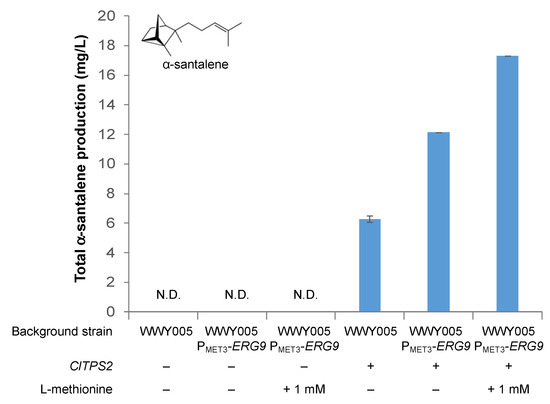 We transformed strains WWY005 PMET3-ERG9 and WWY005 with the plasmid overexpressing ClTPS2 and measured the production of α-santalene by the resulting strains in media either with or without L-methionine supplementation (Figure 6). Without L-methionine supplementation, strain WWY005 PMET3-ERG9 harboring the ClTPS2 overexpression plasmid produced α-santalene at a titer of 12.1 ± 0.1 mg/L, a 94% improvement in titer compared to the level observed in strain WWY005 harboring the same ClTPS2 overexpression plasmid (6.3 ± 0.2 mg/L). The titer of α-santalene was further improved to 17.3 ± 0.1 mg/L when 1 mM L-methionine was supplemented to the fermentation medium. Our results suggest that ERG9 downregulation is a viable strategy for improving fragrant terpenoid production.