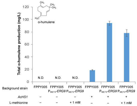 We obtained an even more dramatic improvement in α-humulene production when ERG9 was repressed (Figure 7). Specifically, without L-methionine supplementation, strain FPPY005 PMET3-ERG9 harboring the AcHS1 overexpression plasmid produced α-humulene at a titer of 94.1 ± 3.3 mg/L, a 5.0-fold improvement in titer compared to the level observed in strain FPPY005 harboring the same AcHS1 overexpression plasmid (18.7 ± 0.8 mg/L). Interestingly, the addition of 1 mM L-methionine to the production media did not further increase α-humulene titer (as was the case for α-santalene production) but rather decreased the titer to 78.1 ± 5.3 mg/L, a 17% decrease compared to no additional L-methionine supplementation. Accumulatively, these results underscore the importance of fine-tuning the level of ERG9 repression. Moreover, similar results in both strains (FPPY005_39850 PMET3-ERG9 and WWY005 PMET3-ERG9) suggest that the strategy of ERG9 repression to improve terpenoid production is general and may not be specific to the background strain.