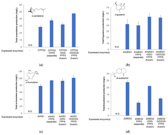 Improving fragrant terpenoid production via enzyme fusion. (a) Production of α-santalene in engineered strains overexpressing ClTPS2 either alone or as fusion enzymes with FPPS; (b) Production of δ-guaiene in engineered strains overexpressing AmdGS1 either alone or as fusion enzymes with FPPS; (c) Production of α-humulene in engineered strains overexpressing AcHS1 either alone or as fusion enzymes with FPPS; (d) Production of β-eudesmol in engineered strains overexpressing ZzBES2 either alone or as fusion enzymes with FPPS. N.D. not detected.