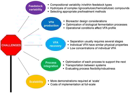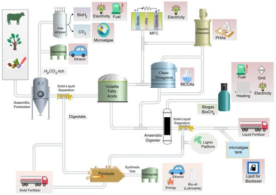 The ultimate purpose of an AD-based biorefinery system is to optimize resource-use efficiency while minimizing waste; this is typically accomplished by maximizing energy/biogas production. The generation of alternative valuable by-products, in addition to biogas, represents a new opportunity to enhance resource recovery (Figure 1). An important value-added by-product, VFAs, are produced during the initial phases of AD in a process known as acidogenic fermentation. VFAs have a wide range of potential applications in the biorefinery industry where they can be used as feedstock for various bio-based products. For instance, VFAs are considered a potential platform for the production of biodegradable PHA polymers []. Currently, synthetically produced VFAs are used in the food and beverage industries, as well as in pharmaceutical and synthetic chemistry. The ratios of the specific volatile fatty acids that are produced via acidogenic fermentation are dependent on the feedstock biomass’ composition, the extent of hydrolysis, operational conditions, reactor design, and the structure of the microbial community. Research investigating these parameters is being carried out and promises to greatly improve the efficiency and stability of the acid-forming stage.