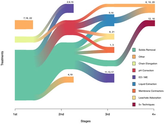 Processes used to separate VFAs from fermentation liquors. Sankey plot showing the variety of VFA harvesting processes as a flow of stages (1st, 2nd, 3rd, and 4+). Technologies using similar principles and materials were grouped together; for example, electrodialysis and membrane electrolysis were grouped together since they both use membranes and current driven separation of solutes. Technologies were classified as “other” if they were used by only a single study at any given stage. References: 1—[]; 2—[]; 3—[]; 4—[]; 5—[]; 6—[]; 7—[]; 8—[]; 9—[]; 10—[]; 11—[]; 12—[]; 13—[]; 14—[]; 15—[]; 16—[]; 17—[]; 18—[]; 19—[]; 20—[]; 21—[]; and 22—[].