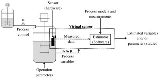 VSs are classified into two types: techniques based on historical data and model-based techniques. In the first case, the VS uses the historical values of the available measurements to build a model that allows the inference of the variables of interest. In this class of techniques, artificial neural networks, vector-supported machines, and regressive models stand out []. On the other hand, model-based techniques combine online measurements using physical sensors and an estimation algorithm based on an auxiliary system built using a model of the fermenter []. Figure 1 shows a general scheme of the implementation of virtual sensors based on a model implemented in a biological system.