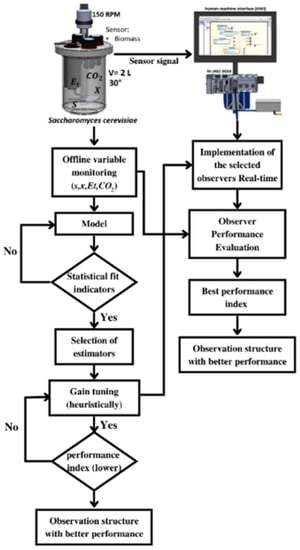Once the bioreactor model was established and validated, the observability of the model was evaluated through a graphic methodology based on an inferential diagram. To show the ideal performance of the selected observers’ structures, they are numerically implemented via dynamic simulations, to evaluate their performance, with the integral absolute error index (IAE) and the integral squared error index (ISE). The second phase of this methodology was the implementation in real-time, of the proposed sliding-mode observers. The performance of each observer was also evaluated using IAE and ISE where the estimation errors were defined as the difference between experimental values and the values of the state observers.
