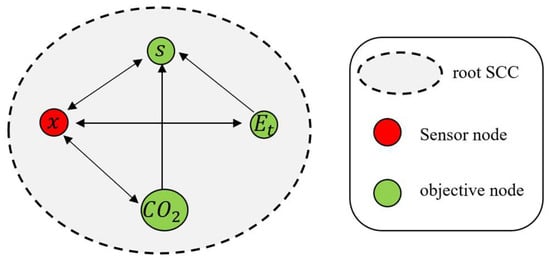 This technique explicitly takes advantage of the network structure of the dynamic system []. Equation (5) can be structurally represented as a corresponding inference graph whose nodes are the internal state variables = {, …, }.