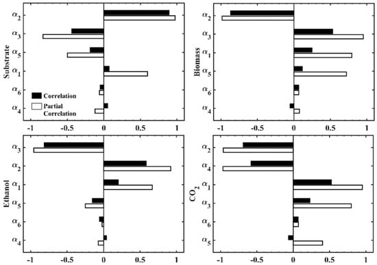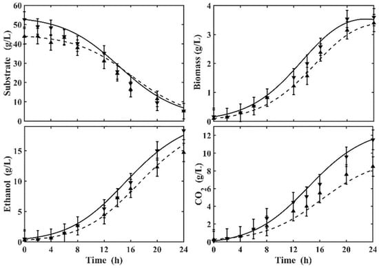 As is well known, unstructured models describe fermentation processes, considering that microorganisms and/or cells have a fixed and simple composition. However, by idealizing the process conditions, they are not always able to describe the real dynamics. On the other hand, the so-called structured models use a more detailed approach to cell metabolism, aimed at better describing the dynamic behavior of the process [,]. Within the structured models we can find the so-called compartmental models. These combine a better description of the behavior of the fermentation that includes the substrate consumption and the generation of the metabolites of interest, with reasonable mathematical complexity and a smaller number of parameters [,].