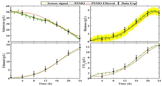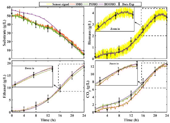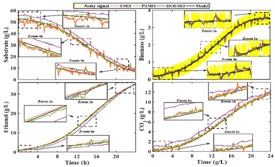 Figure 11 shows the estimates produced by the PSMO without and with the filter (Equation (17)). Note that the filter reduces the effects of measurement noise and that the observer gains have been adjusted for measurement noise. However, the observer had robust properties against disturbances in measurements. Figure 10 graphically confirms how the PSMO had a good performance, adjusting to the experimental data, although the measurement signal was subjected to a treatment to reduce noise.