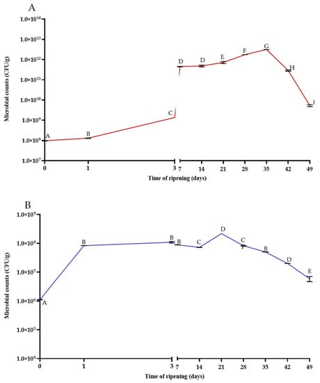 The lactic acid bacteria (A) and yeasts (B) viability during ripening. Means with different letters (A–I) are significantly different at p < 0.05.