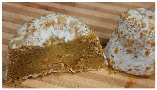 According to Trojanowska et al. [], lupine seeds contain various oligosaccharides, which could be metabolized as substrates for growth. Moreover, the formation of a white, velvety crust was observed during the ripening period (Figure 2). A similar observation was reported in a previous study using P. camemberti for biotransformation of flaxseed oil cake []. In fact, P. camemberti is an aerobe and always grows on the surface of cheese [].