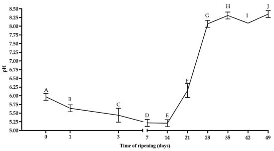 Changes in pH during the ripening time. Means with different letters (A–J) are significantly different at p < 0.05.