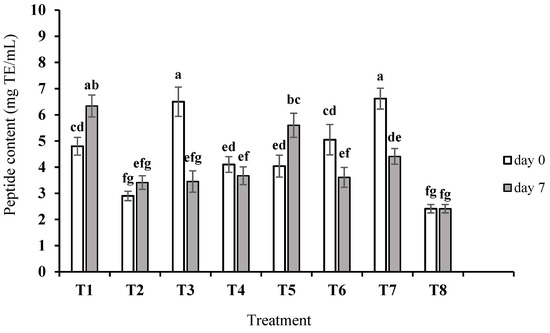Proteolysis extent based on peptide content equivalent to tryptone in fermented milk samples after fermentation (day 0) and after 7 days of storage. T1, T2, and T3 indicate fermented milk with L. delbruekii subsp. bulgaricus ORT2, L. reuteri SRM2, and L. lactis subsp. lactis BRM3, respectively; T4: fermented milk with L. delbruekii subsp. bulgaricus ORT2 and L. reuteri SRM2; T5: fermented milk with L. delbruekii subsp. bulgaricus ORT2 and L. lactis subsp. lactis BRM3; T6: fermented milk with L. lactis subsp. lactis BRM3 and L. reuteri SRM2; T7: fermented milk with L. delbruekii subsp. bulgaricus ORT2, L. reuteri SRM2 and L. lactis subsp. lactis BRM3; T8: acidified milk with lactic acid. Different letters show significant differences (p < 0.05) among all the fermented samples during 7 days of storage.