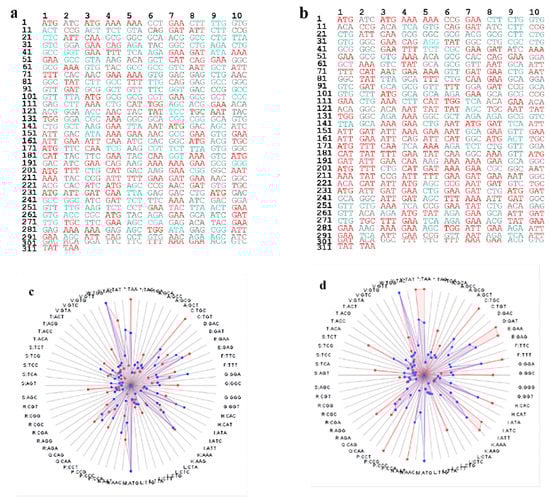 (a) Original sequence. (b) Optimized sequence. Relative codon frequency distribution. Color of codons indicates the frequency of that codon with respect to the host. Rarely used codons are shown in cyan and frequently used codons are shown in red. A redder codon indicates higher frequency. Redder codons compared with the other codons mean that they are better suited for the host codon bias, resulting in high expression. (c) Original sequence. (d) Optimized sequence. Codon relative frequency radar plot. The relative codon frequency distribution shows the frequency of each individual codon and this radar plot shows the suitability of the codon usage profile between the optimized sequence (show in red) and host (shown in blue). A better curve match means it is more adequate.