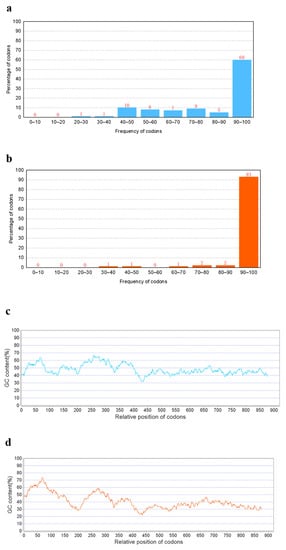 (a) Original sequence. (b) Optimized sequence. Frequency of optimal codons. Shows the percentage distribution of codons; codons with a higher percentage are more frequently used. (c) Original Sequence (47.1%). (d) Optimized sequence (40.3%). GC content adjustment. The ideal percentage range of GC content is between 30% and 70%, ideally 40–60%.