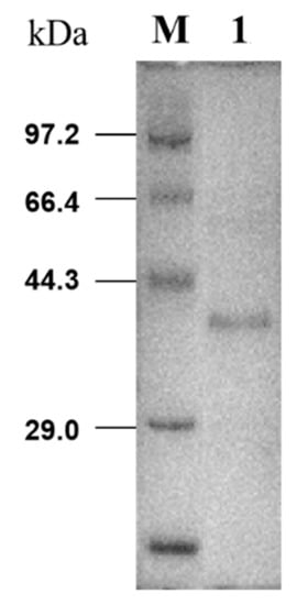 As observed from the SDS-PAGE, the recombinant collagenase was efficiently purified. Its relative molecular mass was estimated to be 35.4 kDa (Figure 4).