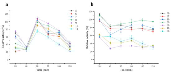 As presented in Table 3, the maximum collagenase activity was observed at pH 9.0. The enzyme was relatively stable during the pH treatment for 60 min, with approximately 60% of its activity retained in the pH range of 8–10 for 90 min (Figure 5a). This result is consistent with the collagenase activity from Streptomyces parvulus [].